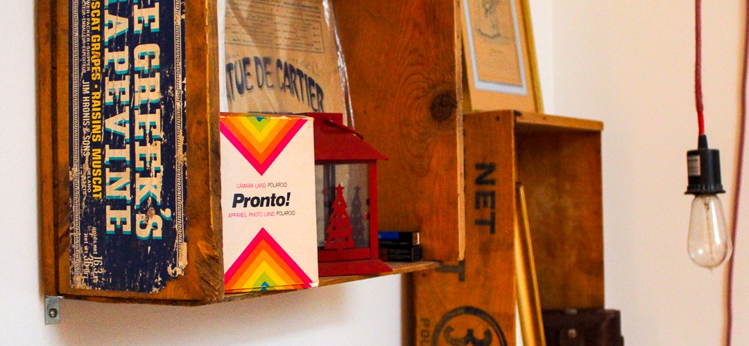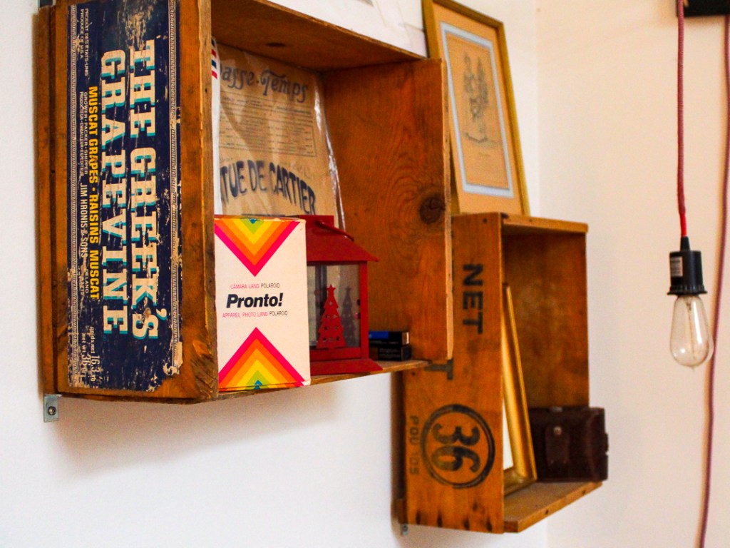 Là aussi, comme pour l’échelle, il est assez facile de trouver des caisses en bois. Il y en a de tout les styles. Les plus recherchées et difficiles à trouver sont sans hésiter les caisses de boisson (Coca-Cola en particulier). Ici, je me suis satisfait de vieilles caisses en bois qui servaient pour distribuer des fruits et des légumes. Quelques fixations au mur et le tour est joué.