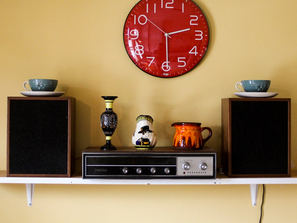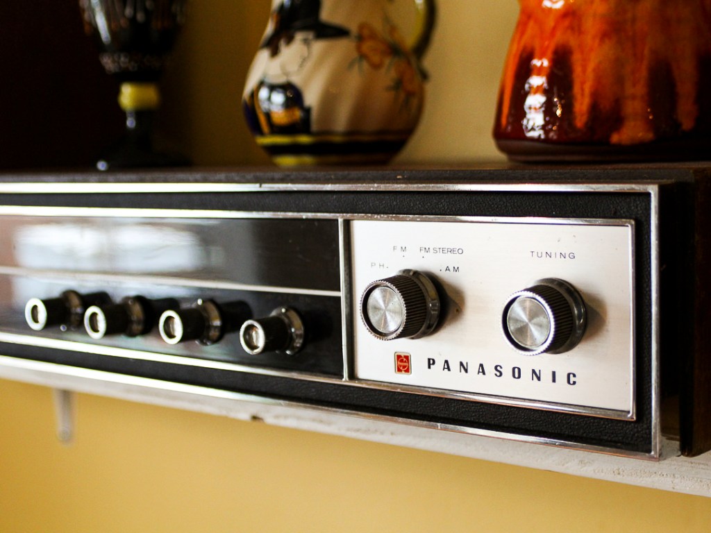 Autre découverte, dont je n’étais pas sûr de la possibilité de pouvoir l’utiliser : une radio avec ses deux enceintes. La caisse de la radio était décollée et les câbles très usés. J’ai tout de même rapporté cette trouvaille à la maison pour me rendre compte, après avoir changé les câbles et recollé la caisse, qu’elle fonctionnait admirablement. Les deux enceintes sont de bonne qualité et offrent un très bon son! Je la trouve jolie cette radio Panasonic. Je la date des années 70.