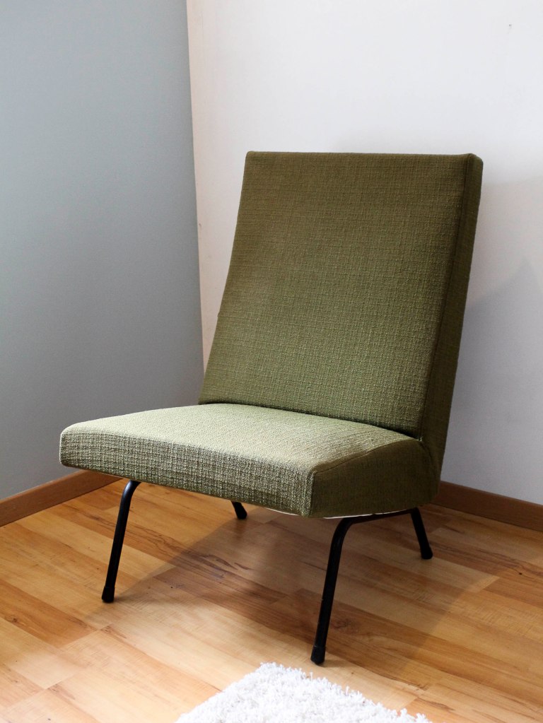 Chauffeuse modèle 743 par Joseph-André Motte pour Steiner. Fabrication des années 60. En bon état, seules les mousses de l’assise et du dossier ont été changées. Structure, piètement, ressorts d’origine. Tissu en laine de couleur vert kaki d’origine en bon état. Étiquette en métal marqué sièges Steiner sous l’assise.