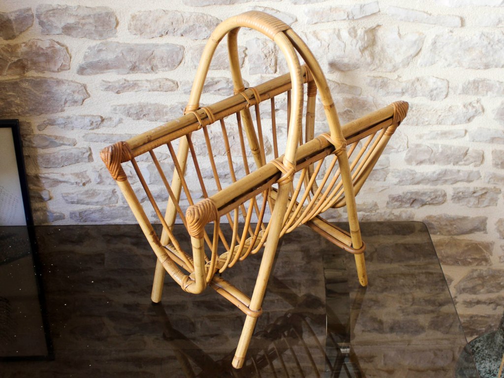 Porte-revue en rotin de belle facture. Très bel objet de déco qui reste utilitaire. Fabrication des années 70. En très bon état. Hauteur: 58cm. Longueur: 52cm.